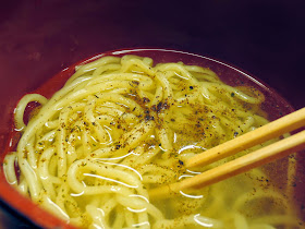 残り三分の一になったところで黒七味を麺に振りかけます。
