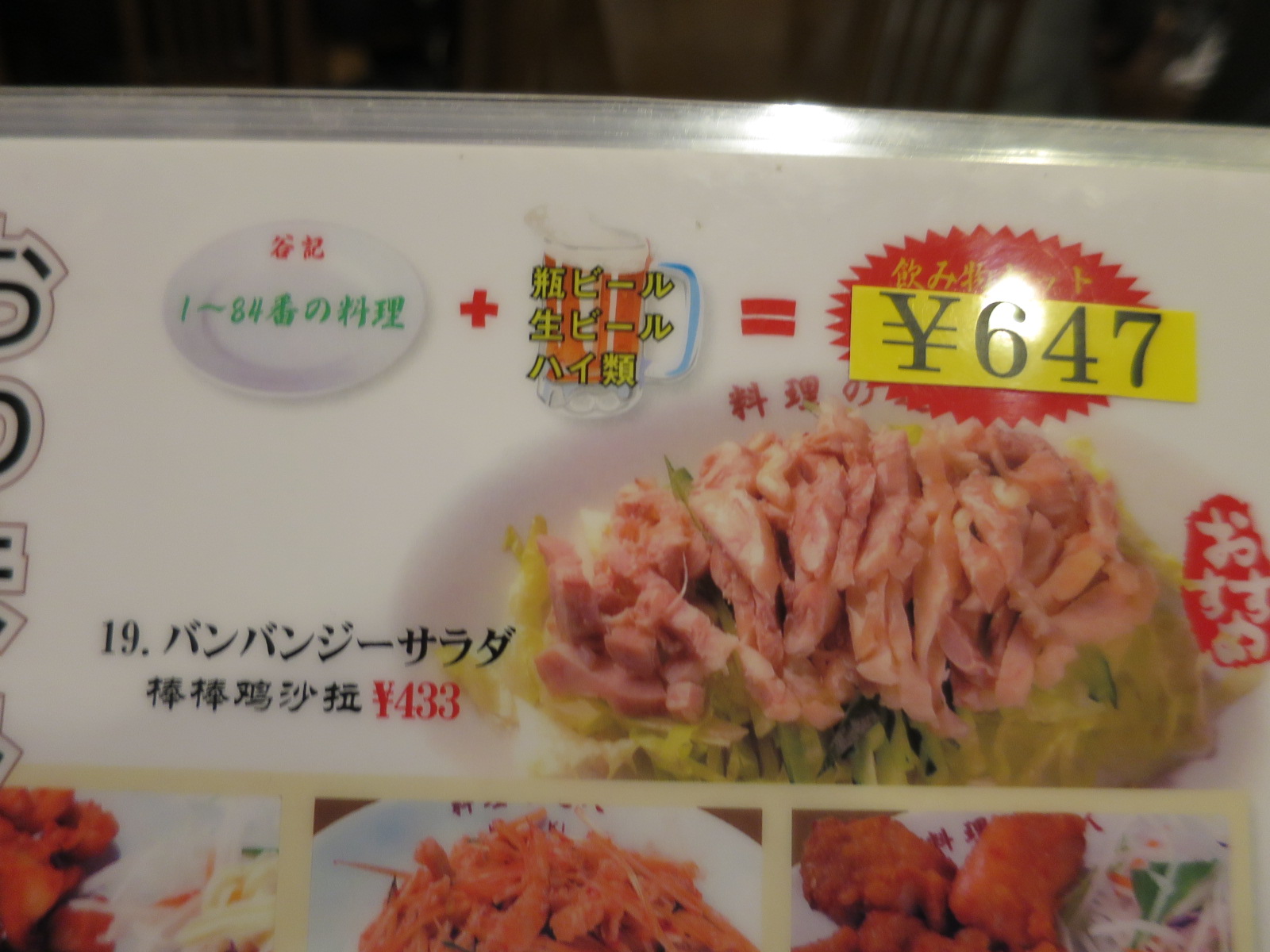 例えばこの19番のバンバンジーサラダと生ビールを頼めば433円+422円=855円。