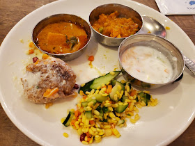 アヴァイル(野菜とココナッツのシチュー)とダヒワダ(ドーナツのヨーグルトスープ浸し)。